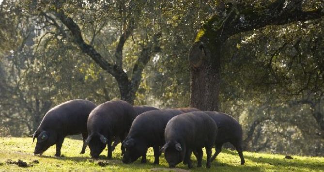 Their colour is generally on the darker side of grey. In Spanish this pig is called Pata Negra (black hoof). You can find these beasts grazing in the Dehesa, rummaging around for fallen acorns from the great Holm Oaks, Gall Oaks and Cork Oak trees. It is from this diet and the pigs being allowed to roam free in the forests that gives the meat its rich, enhanced flavour, and the streaks of fat stored between its muscle fibres that makes this ham a cut above the rest.