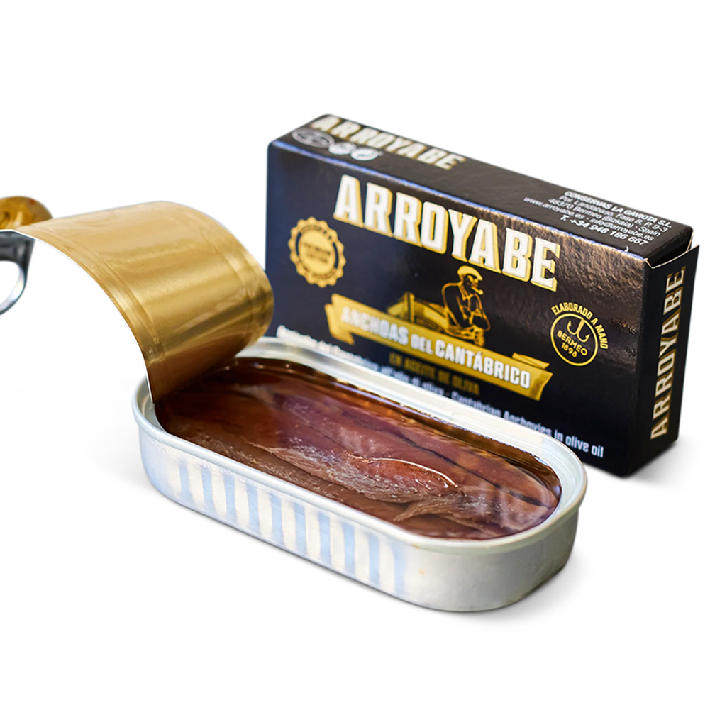 We are proud to present to you Arroyabe Anchovies in Olive Oil. A real delicacy fished from the Bay of Biscay.