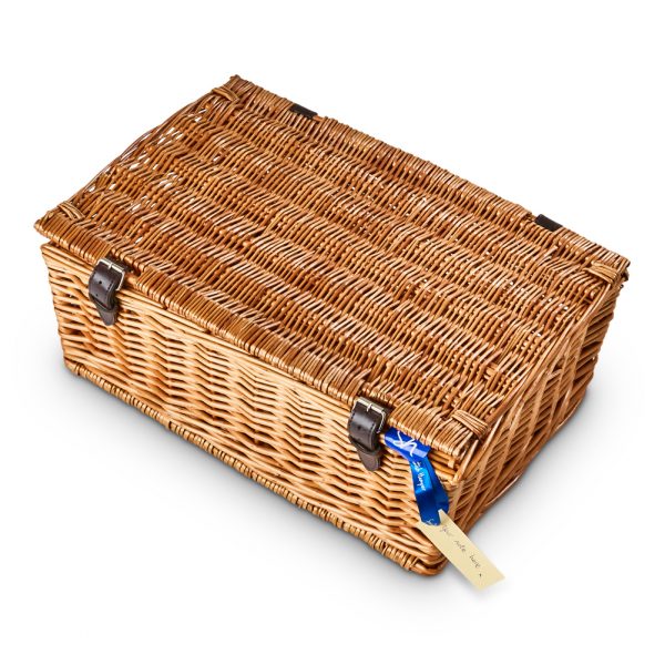 An artisan wicker hamper, with a wicker lid and leather straps. 18 inches of space to fill with your desired products. It fits up to 3 bottles and 12 food items.
