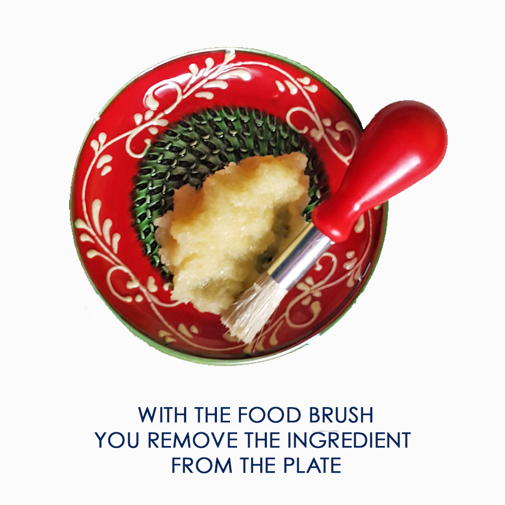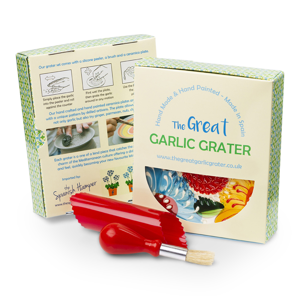 The Set comes with the ceramic grater plate, the food brush and the silicone garlic peeler, all boxed up in a beautifully presented gift box with information about how is made and how to use it at the back.