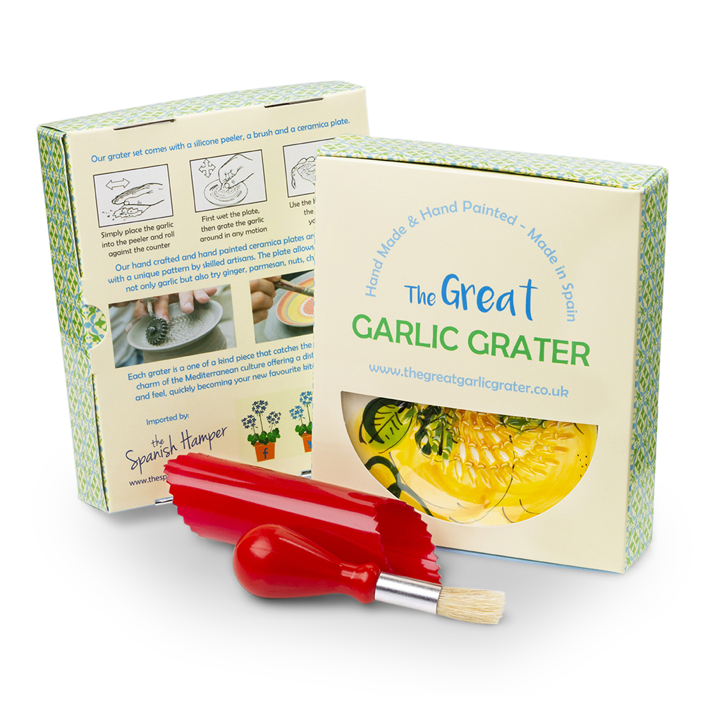 The Set comes with the ceramic grater plate, the food brush and the silicone garlic peeler, all boxed up in a beautifully presented gift box with information about how is made and how to use it at the back.