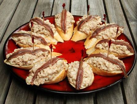 This Basque tapas recipe consists of a slice of crispy long bread loaded with a Yellowfin Tuna Salad with onion, mayonnaise and lemon juice, garnished with an Anchovy Fillet.